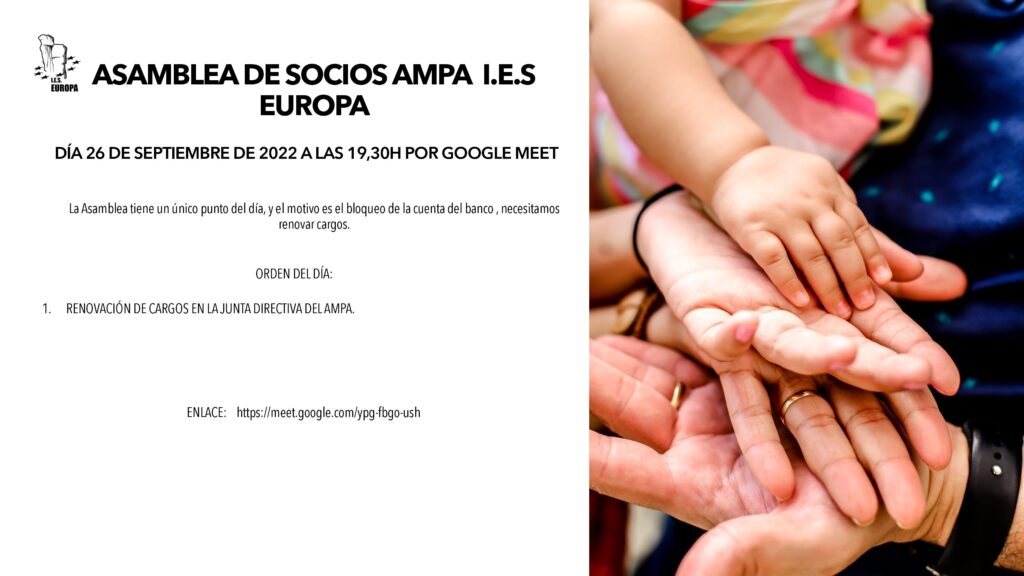 por el asunto del bloqueo de la cuenta del banco del AMPA, tenemos que convocar urgentemente una Asamblea de Soci@s, será ONLINE por GOOGLE MEET, este próximo LUNES 26/09/2022 a las 19:30 mediante el enlace: https://meet.google.com/ypg-fbgo-ush