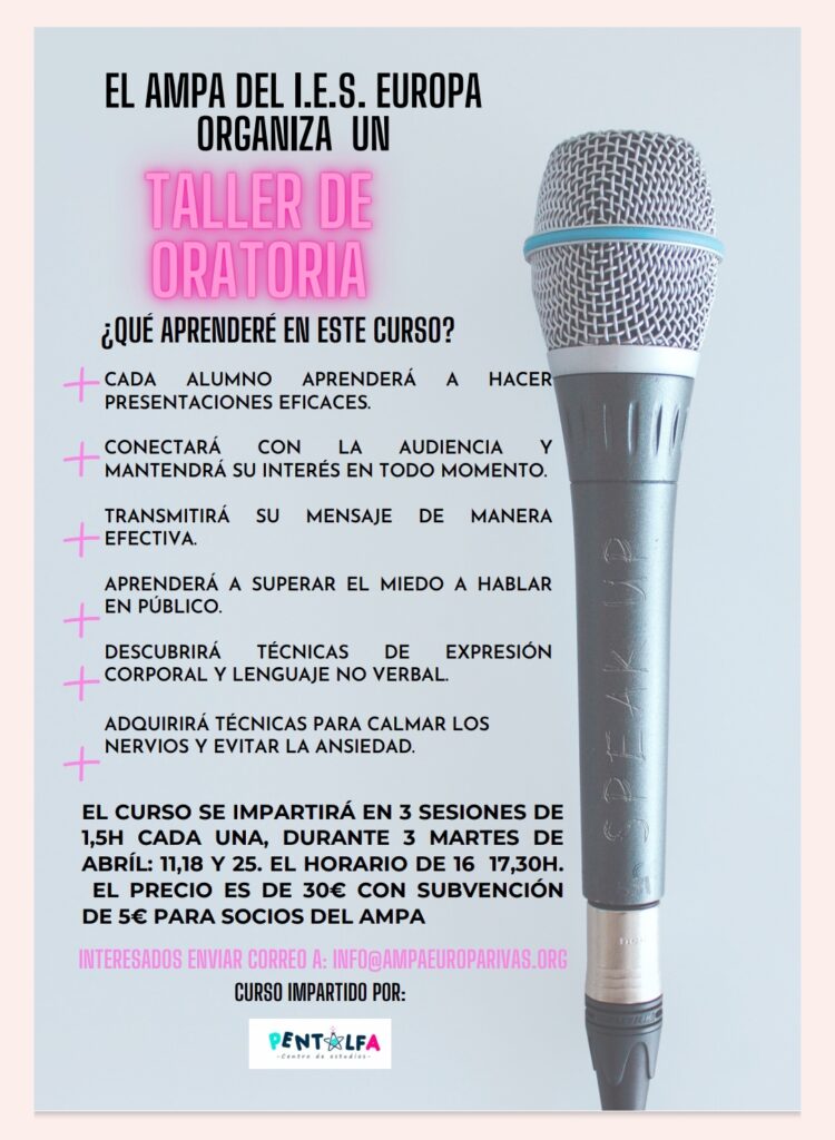 Os escribimos para informar que estamos organizando desde el AMPA, para l@s alumn@s, un TALLER DE ORATORIA, impartido por el Centro de Estudios PENTALFA. El curso se hará en 3 sesiones, de 1 hora y media cada una.