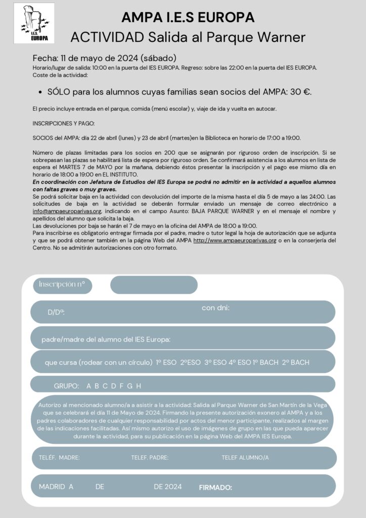 Buenas noches, ya tenemos lista la salida a la Warner. Adjuntamos el cartel y la ficha de inscripción. Debéis traerla los días 22 y 23 de abril de 17 h a 19 h a la Biblioteca del IES. El coste es de 30 euros SOLO PARA SOCIOS DEL AMPA EUROPA.