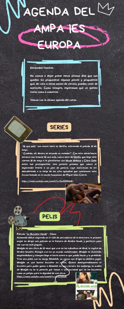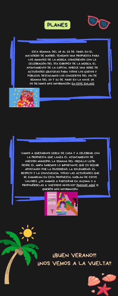 ¡Hola de nuevo! Os enviamos la agenda del tercer trimestre, elaborada por miembros del AMPA.