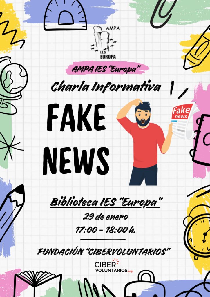 Hola de nuevo, ahora os adjuntamos un cartel sobre una charla para familias que nos ofrecen para el lunes 29 de enero, de 17 a 18 horas, sobre las Fake News. La imparten desde la asociación Cibervoluntarios, que trabaja con la Comunidad de Madrid.